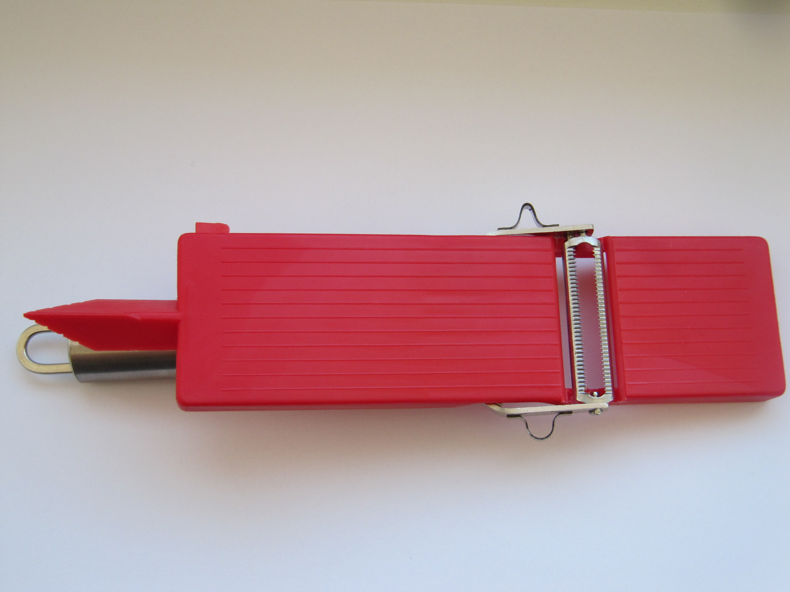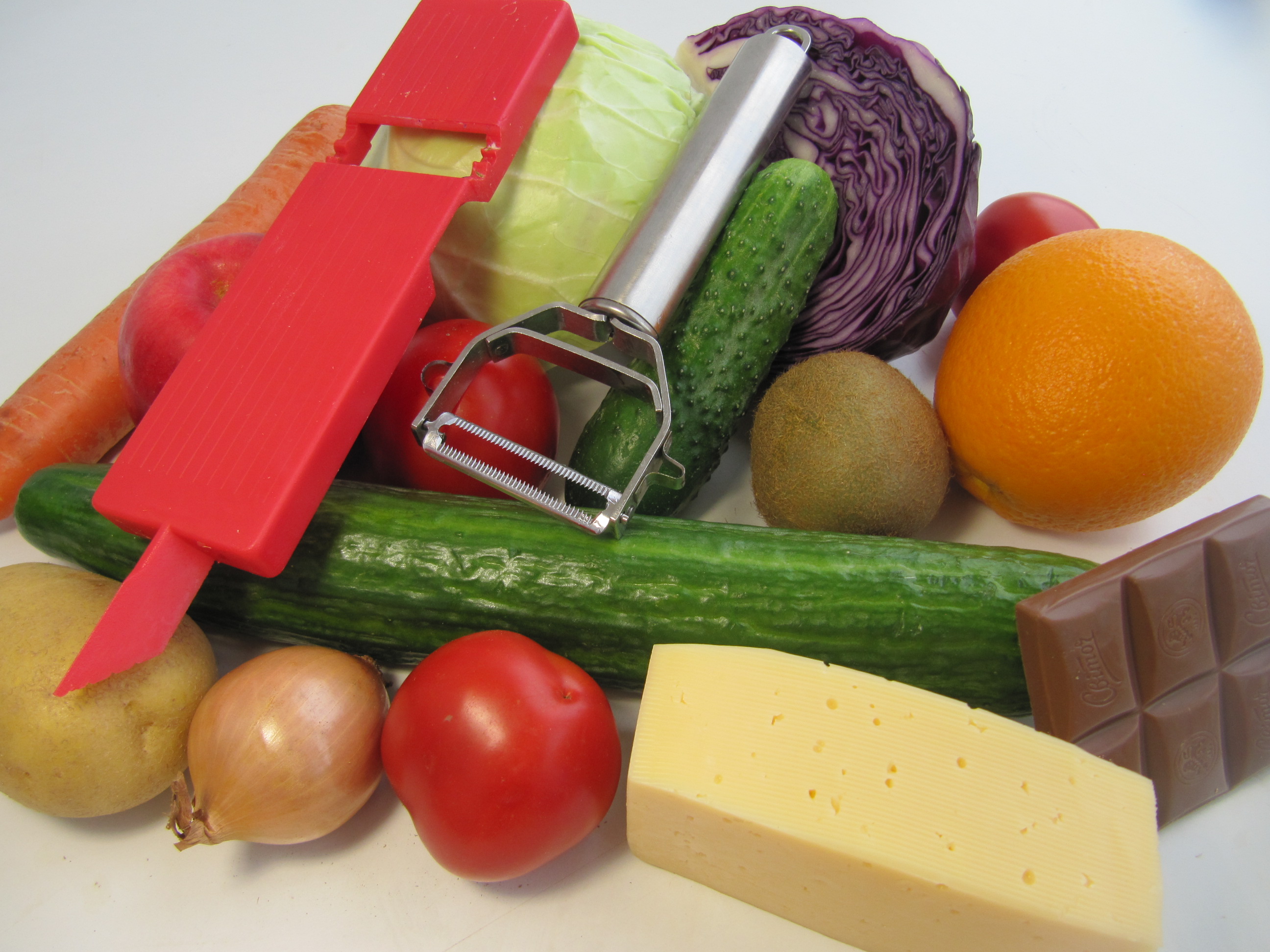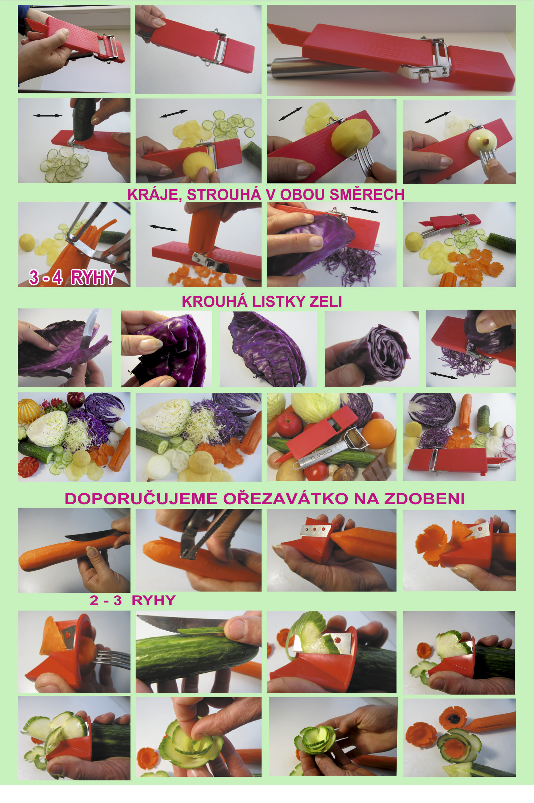 Škrábka škrábe,loupe v obou smerech. Na brambory,mrkev,okurku, řepu, jablko, kiwi, Krouhá zeli obou smerech. Zdobi. Kráječ kráje,strouha v obou směrech na plátky. Nůž na zeleninove nudličky a bramborovu slámu.