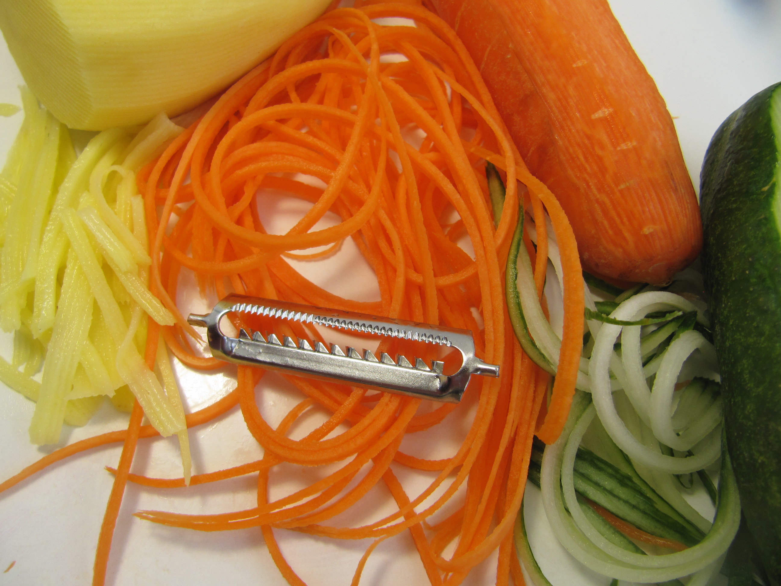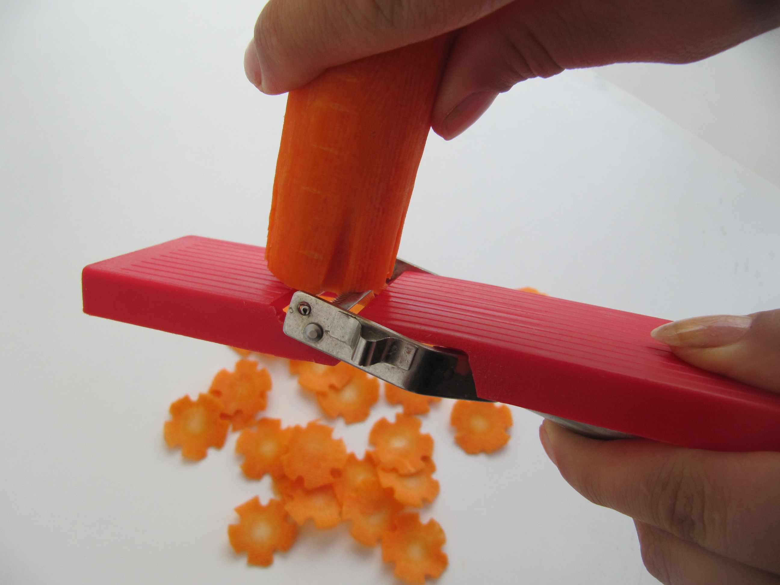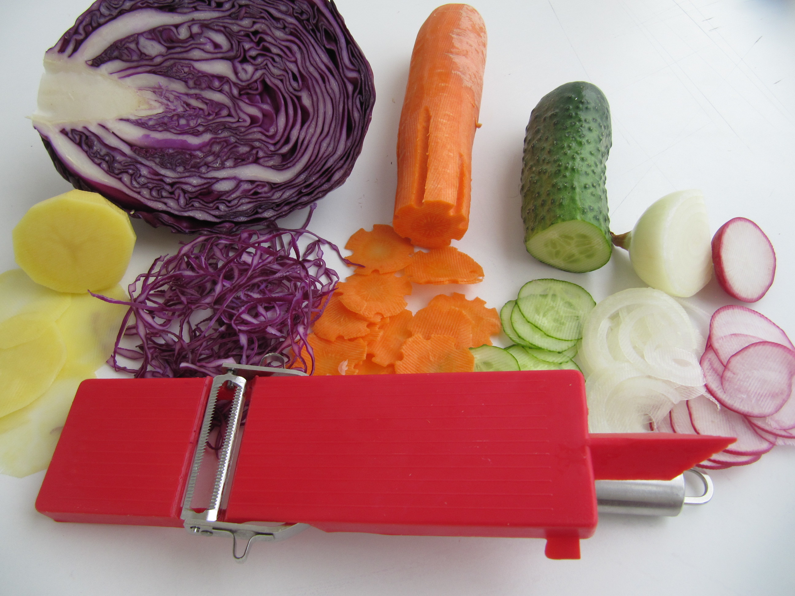 Škrábka škrábe,loupe v obou smerech. Na brambory,mrkev,okurku, řepu, jablko, kiwi, Krouhá zeli obou smerech. Zdobi. Kráječ kráje,strouha v obou směrech na plátky. Nůž na zeleninove nudličky a bramborovu slámu.